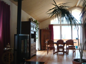 Baujahr Bauweise D�mmung Fassade Dach Fenster Boden Innent�ren Wandoberfl�chen W�rmeerzeugung | 2008 Ortbeton / Holzelementbau nach baubiologischen Grunds�tzen Holzhobelspan L�rche / Stahl- Sinuswelle Tonziegel Holzrahmenfenster Massivholz - Riemen Douglasie / Fichte Massivholz - Blockrahmen Tapete mit mineralischem Anstrich W�rmepumpe Luft / Wasser mit Heizk�rper Zimmerofen |