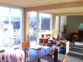 Baujahr Bauweise D�mmung Fassade Dach Fenster Boden Innent�ren Wandoberfl�chen W�rmeerzeugung Brauchwarmwasser Spezielles | 2012 / 2013 Ortbeton / Holzelementbau nach baubiologischen Grunds�tzen Zellulose Fichte Sinus- Wellblech Holzrahmenfenster Massivholz - Riemen Fichte / Unterlagsboden mit Keramikplatten Massivholz - Blockrahmen Silikatanstrich mit Quarzsand W�rmepumpe Luft/ Wasser mit Bodenheizung und Heizk�rper Solaranlage Holzdusche |