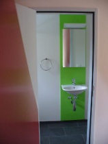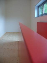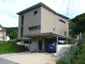 Baujahr Bauweise D�mmung Fassade Dach Fenster Boden Innent�ren Wandoberfl�chen W�rmeerzeugung | 2007 Ortbeton / Holzelementbau nach baubiologischen Grunds�tzen Zellulose Fichte mit Wetterschutzbehandlung Sinus - Wellblech Holzrahmenfenster Fertigparkett Esche und Massivholz Fichte Massivholz - Blockrahmen Lehmputz und Tapete mit mineralischem Anstrich W�rmepumpe Luft / Wasser mit Heizk�rper |